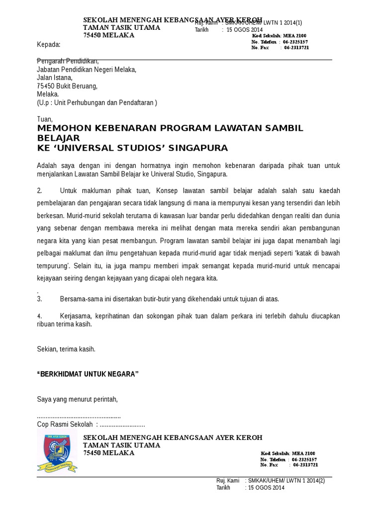 Adalah saya dengan hormatnya memohon kebenaran daripada tuan untuk membawa murid-murid dari sekolah saya untuk melancong ke beberapa tempat luar Negeri Johor. Penjaga tidak boleh memberi akuan penyelesaian mengenai harta modal seksyen 99. Surat kebenaran ibubapa pemeriksaan kesihatan pelajar.