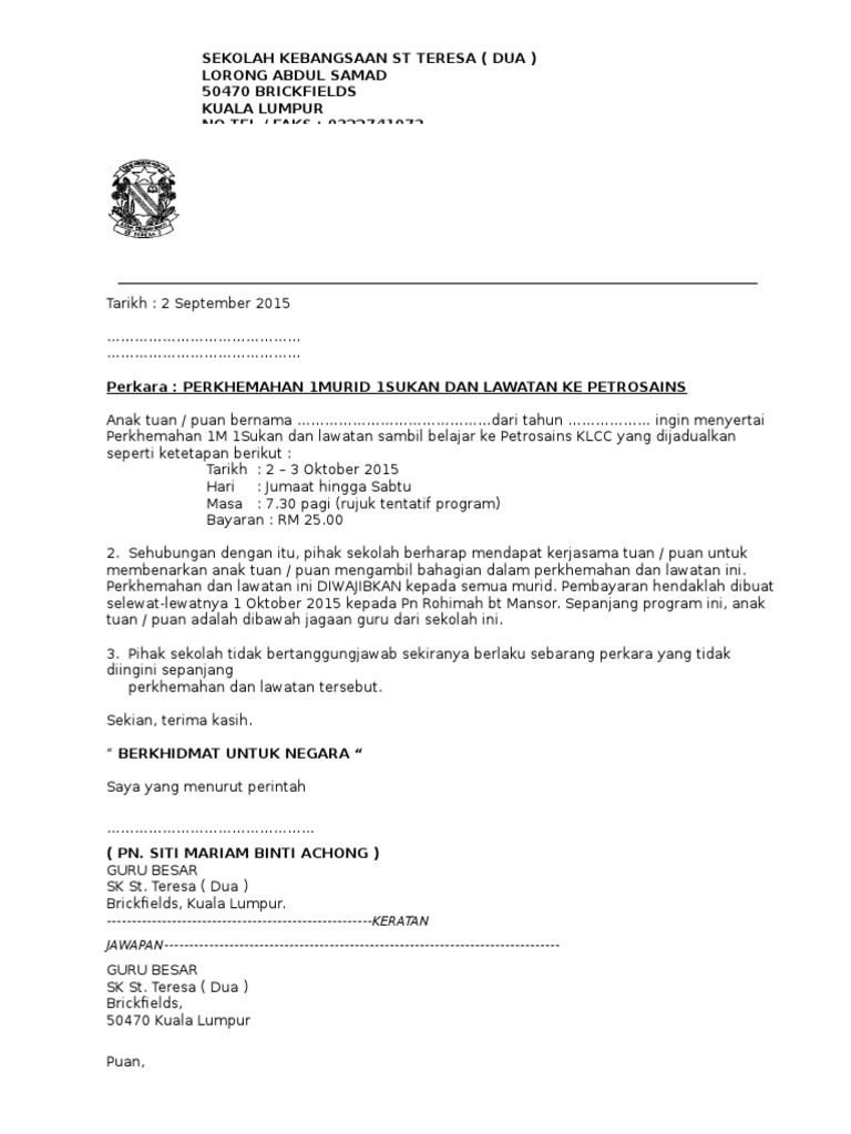 Surat kebenaran ibu bapa untuk lawatan. Surat makluman kepada ibu bapa penjaga sek ren agama integrasi taman keramat facebook. Guru Kakitangan Penjaga Murid SK.