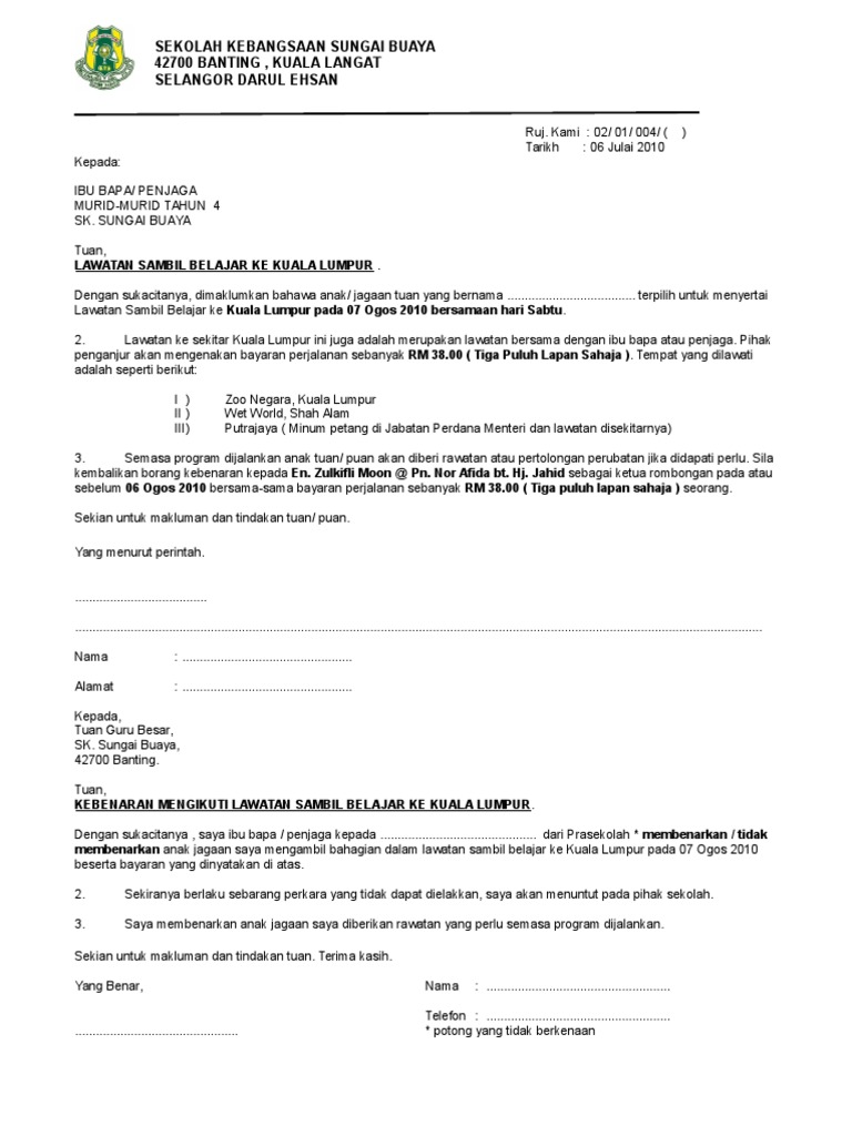 Tuan puan program lawatan sambil belajar ke kuala lumpur salam sejahtera. SURAT AKUAN KEBENARAN IBU BAPAPENJAGA MENYERTAI AKTIVITI KOKURIKULUM LUAR Saya Nama. Dalam ruangan berikutnya mysumber serta.