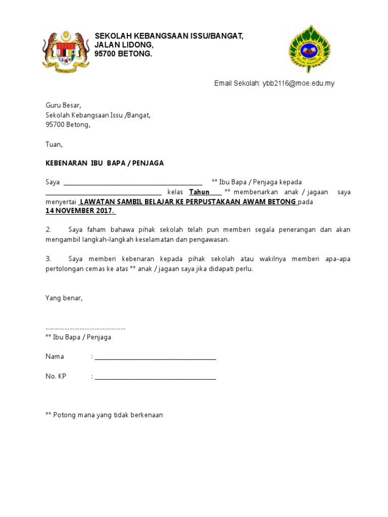 Surat Kebenaran Ibu Bapa Lawatan Sambil Belajar Ke Perpustakaan Awam Betong Pdf
